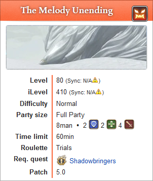 The Melody Unending is a level 80 trial introduced in patch 5.0 with Shadowbringers.
